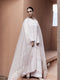 The long cut shirt is made from a lightweight, breathable pure cotton-silk blend fabric features a modest V-neckline finished with delicate scalloped (in-house made) lace. The shirt is embroidered with massive tonal applique and ivory thread work on the front panel and sleeves. It features a grand symmetrical paisley inspired motif. Full length sleeves, side slits (chaaks) and shirt hem (daman) is finished with scalloped edges.