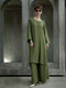 The tunic is paired with matching monochromatic trousers.These are ultra-wide-leg pants that provide a flowing appearance.